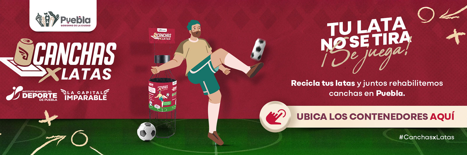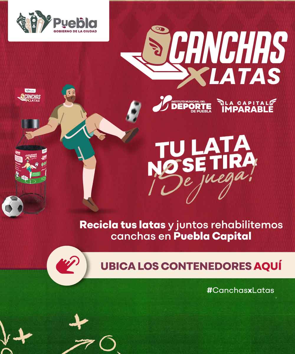 Una iniciativa del Gobierno de la Ciudad a través del Instituto Municipal del Deporte, para posicionar a Puebla como la primera ciudad del país en transformar latas de aluminio en canchas de fútbol rehabilitadas, fomentando la educación ambiental y la integración de la comunidad. No te quedes en la banca.